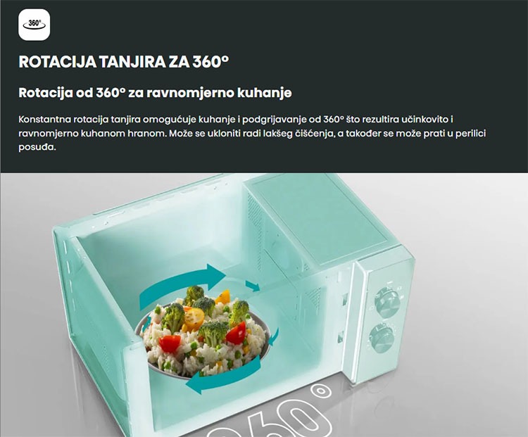 Konstantna rotacija tanjira omogućuje kuhanje i podgrijavanje od 360° što rezultira učinkovito i