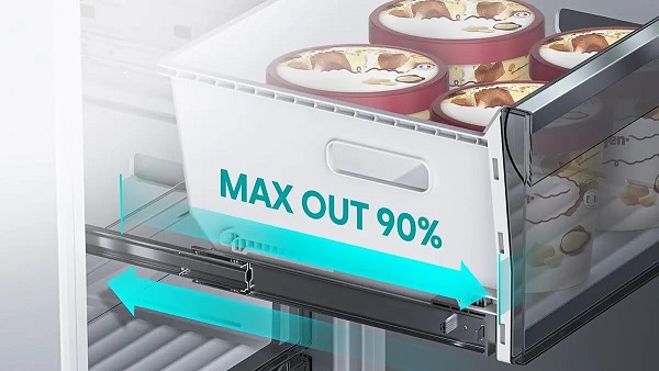 Hladnjak Hisense s izdržljivim metalnim vodilicama ladica omogućuje vam sigurno i jednostavno spremanje velike smrznute robe, pružajući glatko iskustvo otvaranja i zatvaranja.