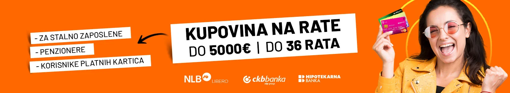 Mogućnost kupovine na 6 (-10% popusta), 12 (-5% popusta) i 24 (-3% popusta) mjesečne rate u našim maloprodajnim radnjama putem kreditnih kartica: HB Premium, SGB La Rata, CKB Shop&Go, NLB Libero.
