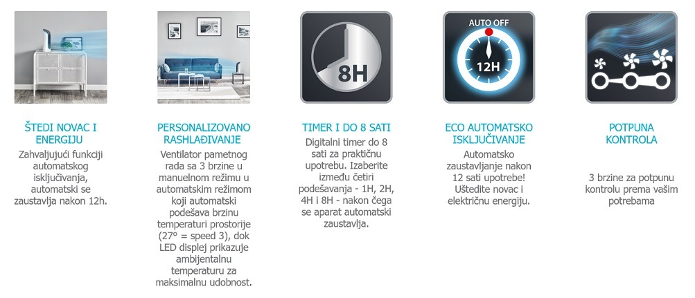 Zahvaljujući 3D tehnologiji protoka vazduha, protok je uvek savršen, a prilagodljiva vertikalna rešetka za usmeravanje vazduha i široka horizontalna oscilacija omogućavaju bolju raspodelu istog. Omogućene su sve performanse i brzina izduvavanja vazduha klasičnim trokrakim stonim ventilatorom. Istovremeno, moderni, tanki i kompaktni mali ventilatori savršeno se uklapaju u bilo koji dom.