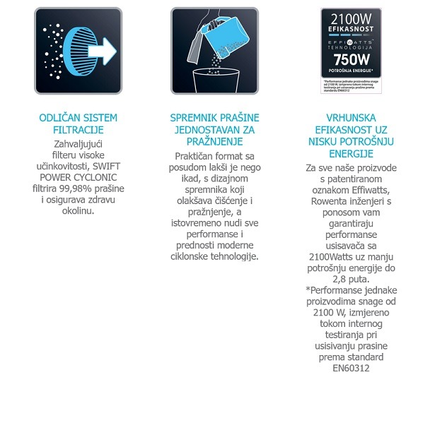 Usisavač Rowenta Swift Power Cyclonic (RO2910EA) nudi izvanredne performanse dubinskog čišćenja u kompaktnom kućištu, dizajniranom za jednostavna svakodnevna rješenja za dom. Napredna ciklonska tehnologija zajedno s visoko učinkovitom usisnom glavom jamči pouzdano i učinkovito sakupljanje prašine iz dana u dan. Poboljšana Effitech tehnologija i sustav filtracije, koji zadržava 99,98 % prašine, osiguravaju čisto i zdravo okruženje uz nisku potrošnju energije. Zbog laganog i kompaktnog dizajna, jednostavan je za rukovanje i spremanje.