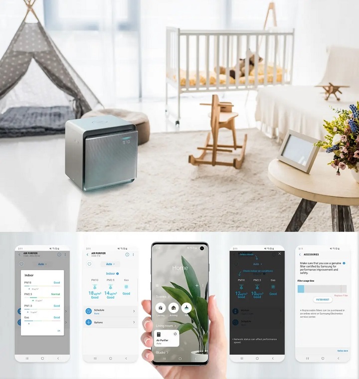 Vodi računa o vazduhu i proveravaj njegovu zagađenost uvek i sa bilo kog mesta. Aplikacija SmartThings* omogućava da se prečistačem upravlja daljinski. Na dodir ili koristeći samo glas** možeš ga uključiti ili isključiti, proveriti kvalitet vazduha, aktivirati druge funkcije i pratiti status filtera.