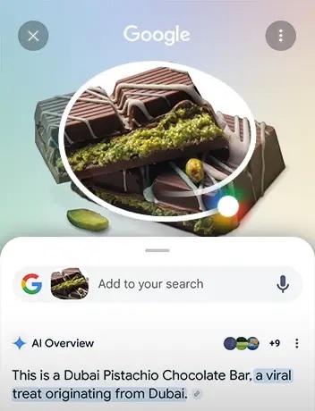 Circle to Search with Google omogućava trenutno pretraživanje bilo čega na ekranu. Samo zaokruži predmet – uključujući sliku, video ili tekst – prstom, i odmah ćeš dobiti rezultat AI pregleda. Čak možeš potražiti i pesmu koju trenutno čuješ bez napuštanja aplikacije