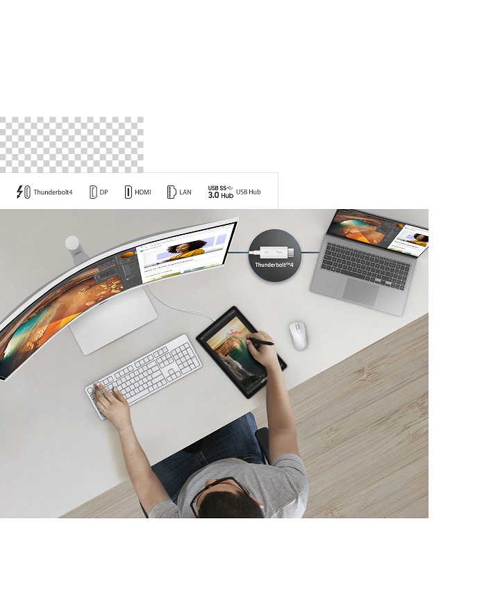 Počisti nered od kablova koristeći brojne portove. Napajaj uređaje preko punjača od 90 W i istovremeno prenosi podatke koristeći Thunderbolt™ 4 povezivanje. HDMI, port za ekran i USB3 čvorište olakšavaju povezivanje sa uređajima, dok LAN port omogućava da se laptop bez porta može povezati sa monitorom kako bi koristio Ethernet