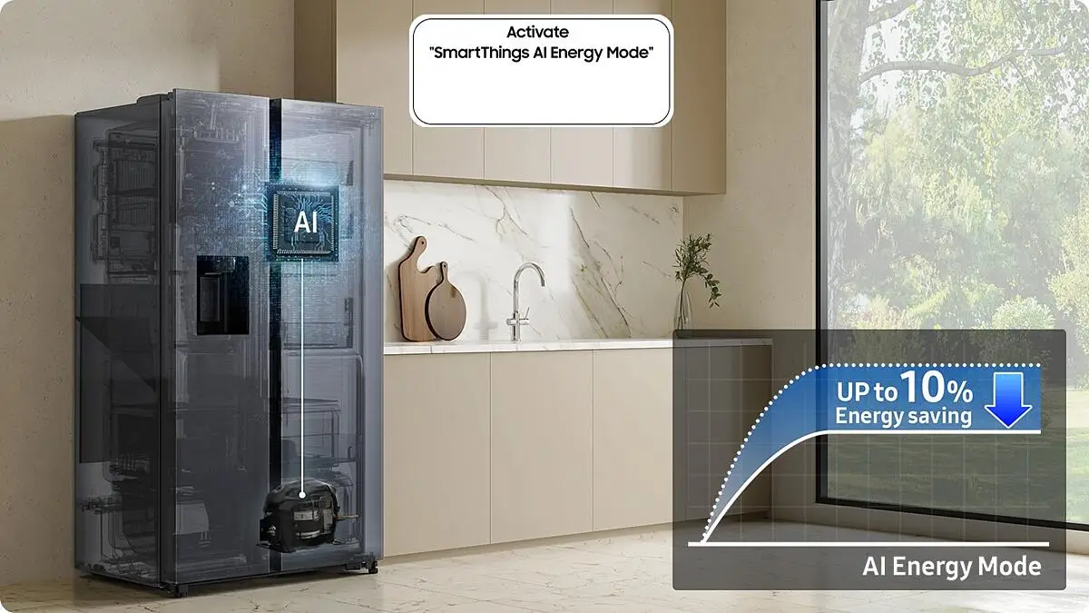 Manja potrošnja energije za do 10% uz AI Energy režim u SmartThings Energy**. Ako tvoja procenjena potrošnja energije pređe unapred podešenu ciljnu vrednost, ovaj režim nudi mogućnost uštede energije***. On inteligentno prilagođava brzinu kompresora i ciklus odmrzavanja na osnovu tvojih obrazaca korišćenja i uslova okruženja.