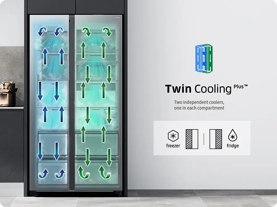 Pobrinuće se da hrana duže ostane sočna i sveža*. Twin Cooling Plus™ prilagođava temperaturu i vlažnost u frižideru i zamrzivaču korišćenjem nezavisnih isparivača, ventilatora i otvora. Ova tehnologija čuva hranu u idealnim uslovima i štiti njen ukus, sprečavajući mešanje mirisa među odeljcima.