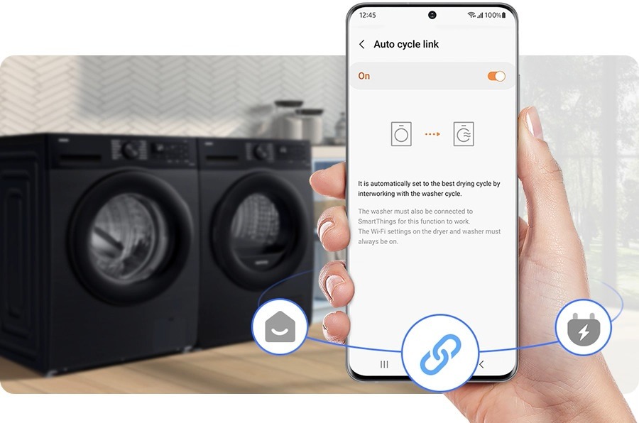 Uživaj u efikasnom pranju bez problema pomoću aplikacije SmartThings. „Energija“ pomaže u upravljanju upotrebom energije. „Kućna nega“ održava mašinu za pranje veša u najboljem stanju. A ako imaš odgovarajuću mašinu za sušenje, predlaže se odgovarajući kurs sušenja nakon pranja kada pritisneš dugme Auto Cicle Link na mašini za sušenje.