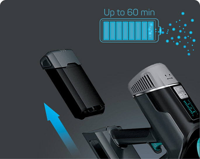 Uz uklonjivu i zamjenjivu bateriju visokih performansi, ovaj usisivač omogućava do 60 minuta neprekidnog čišćenja.