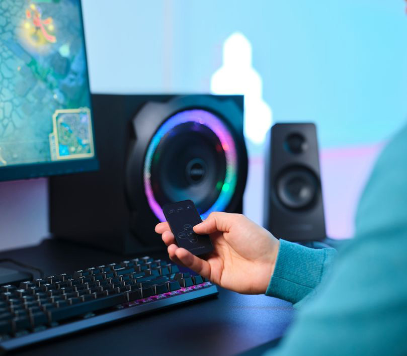 Potpuna kontrola, bez žica Bežični daljinski upravljač omogućava vam jednostavno podešavanje jačine zvuka ili drugih postavki pritiskom na dugme sa bilo kog mesta u sobi - ili direktno sa strane subwoofera.