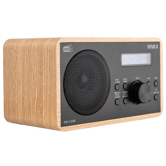 VIVAX DW-2 audio uređaj pruža vam potpuni užitak slušanja radio programa u novoj i nadolazećoj DAB+ digitalnoj tehnologiji. Osim toga, uređaj posjeduje standardni FM radio prijamnik, funkciju sata s budilicom, te reprodukciju zvuka s vanjskih audio uređaja putem Bluetooth bežične veze. U memoriju uređaja može se pohraniti do 30DAB+30FM radio postaja. Sve funkcije lako su dostupne putem LCD matričnog zaslona s pozadinskim osvjetljenjem. Sat se automatski sinkronizira putem DAB signala. Funkcija alarma posjeduje mogućnost ugađanja dva vremena buđenja koje može biti putem radio kanala ili zujalice, a tu je i uvijek dobrodošla funkcija odgode (snooze).