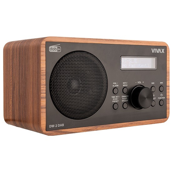 VIVAX DW-2 audio uređaj pruža vam potpuni užitak slušanja radio programa u novoj i nadolazećoj DAB+ digitalnoj tehnologiji. Osim toga, uređaj posjeduje standardni FM radio prijamnik, funkciju sata s budilicom, te reprodukciju zvuka s vanjskih audio uređaja putem Bluetooth bežične veze. U memoriju uređaja može se pohraniti do 30DAB+30FM radio postaja. Sve funkcije lako su dostupne putem LCD matričnog zaslona s pozadinskim osvjetljenjem. Sat se automatski sinkronizira putem DAB signala. Funkcija alarma posjeduje mogućnost ugađanja dva vremena buđenja koje može biti putem radio kanala ili zujalice, a tu je i uvijek dobrodošla funkcija odgode (snooze).