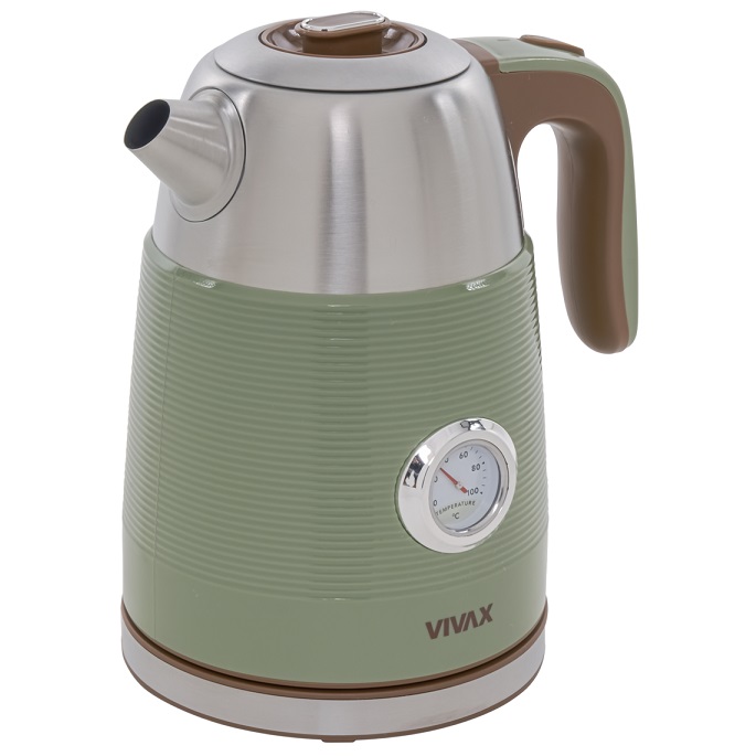 Savršena kombinacija retro dizajna, pastelne zelene boje i nehrđajućeg čelika čini kuhalo za vodu VIVAX WH-170RS istovremeno atraktivnim te učinkovitim. Ergonomski dizajn otvora za točenje vode dizajniran je na način da nema neželjenog prolijevanja vode a filter za kamenac sprječava njegovo nakupljanje.