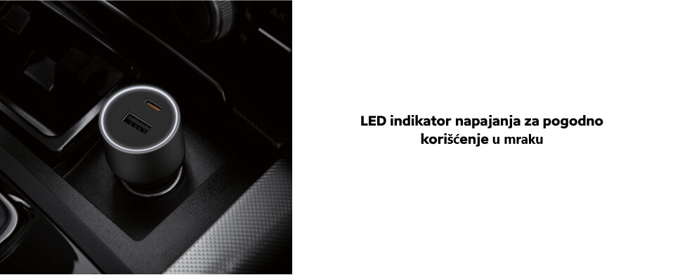 LED indikator napajanja za pogodno korišćenje u noćnim uslovima. Različite boje LED indikatora. Kada je Xiaomi Auto punjač 67W priključen na upaljač indikator svetli belo. Kada se koristi type-C priključak za punjenje pametnih uređaja, indikator prikazuje plavu u srednjoj snazi i žutu pri velikom naponu punjenja.