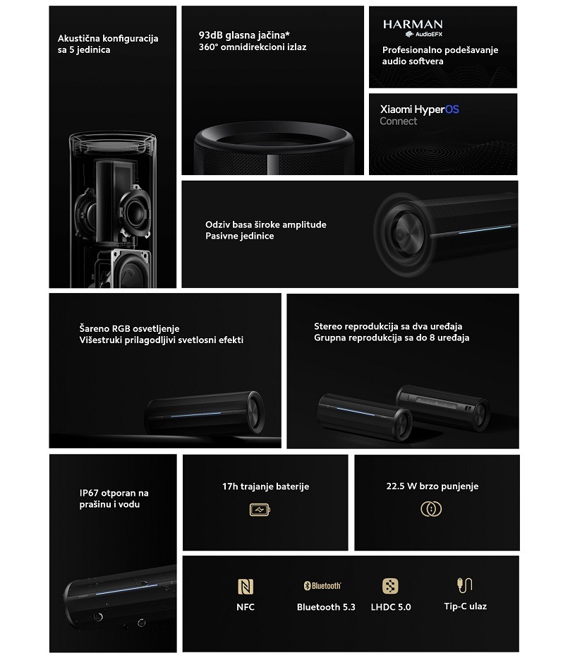 Vodootpornost IP67; Šareni RGB svetlosni efekti; HARMAN AudioEFKS; NFC, Reprodukcija od 360
