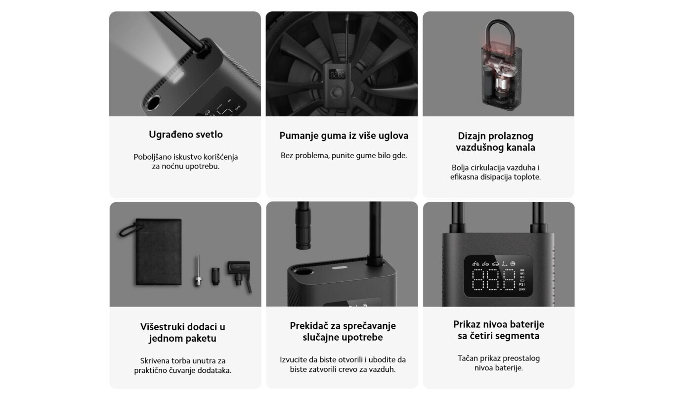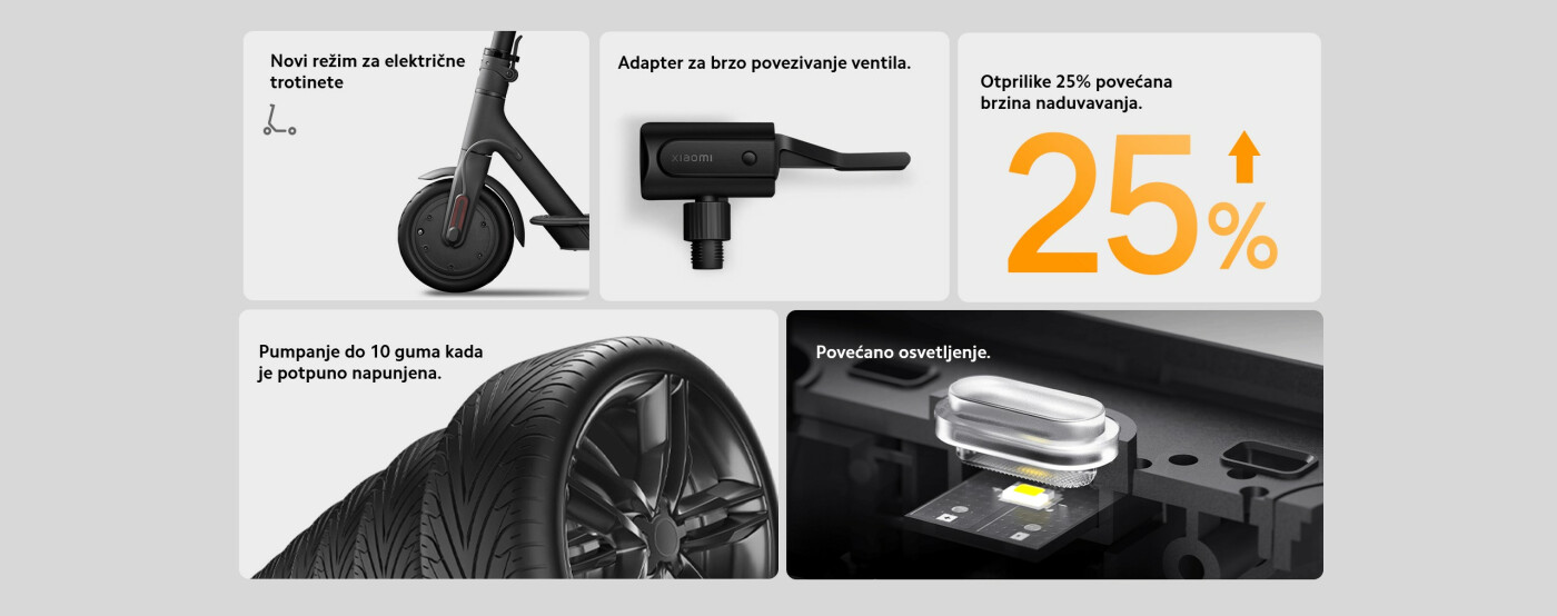 U poređenju sa Xiaomi prenosivom električnom pumpom 1S, detalji su optimizovani, unutarnja struktura je redizajnirana, sa otprilike 25% bržom brzinom naduvavanja, značajan korak napred.