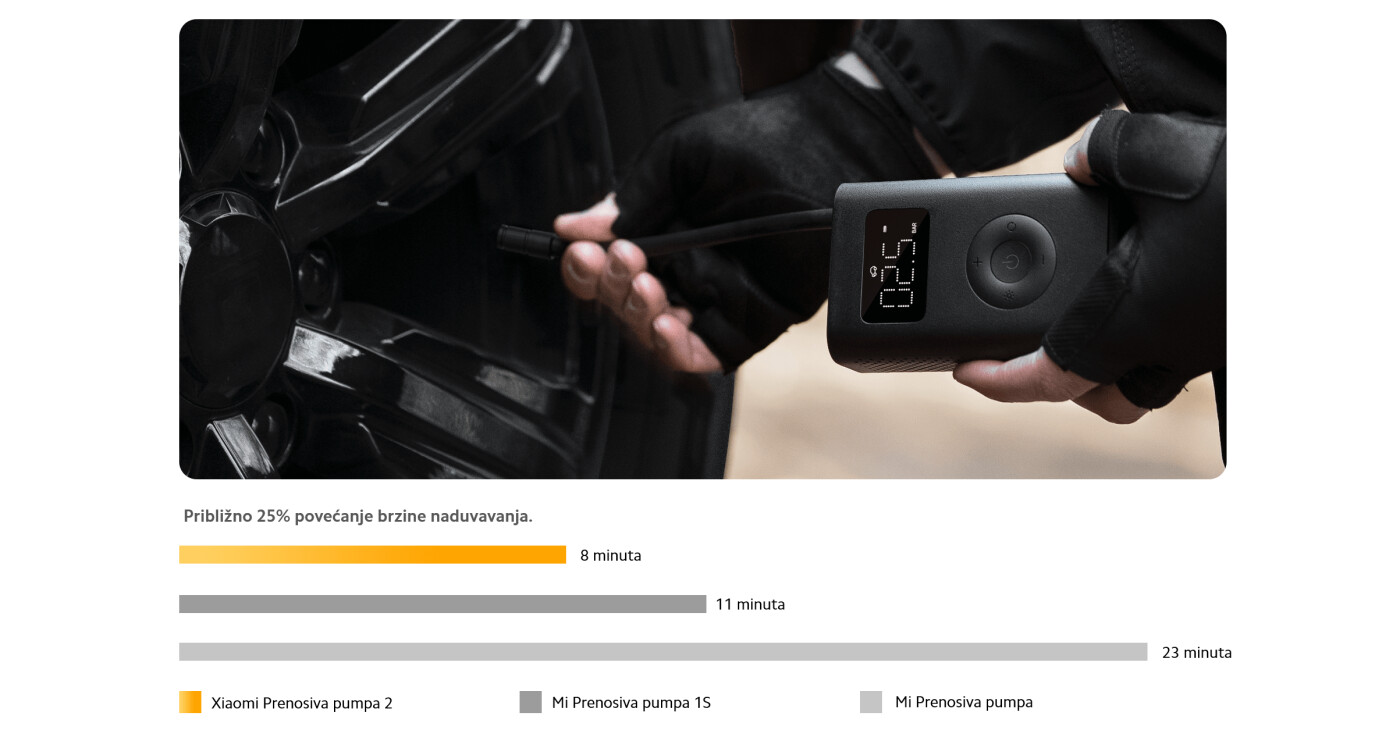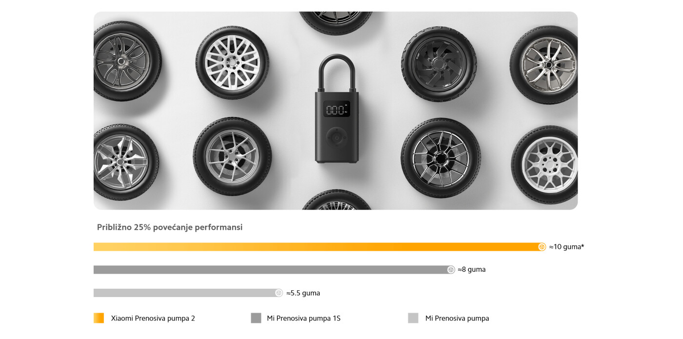 Brža i bolja pomoć sa visokonaponskim magnetnim motorom, pumpa ima ubrzanje brzine od 25%. Može napuniti praznu gumu za samo 8 minuta*, uz snažne performanse naduvavanja.