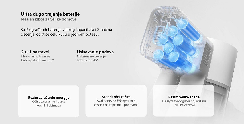 ltra dugo trajanje baterije, Tri režima čišćenja: Eco, Standard, High Power Mode